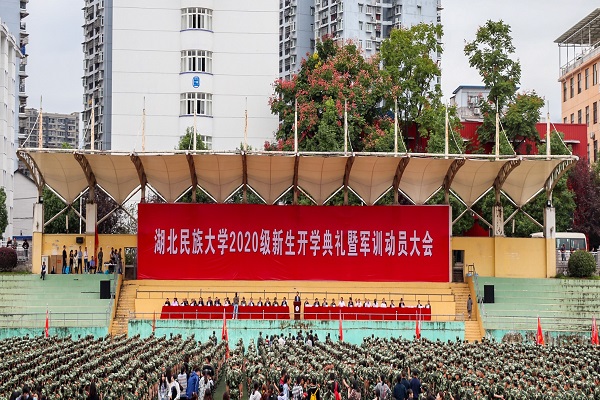 本网讯(记者 张宏迪 通讯员 姜文佳 王语/文 武建鑫 武叶叶/图)9月21日,2020级本科新生开学典礼暨军训动员大会在五环体育场举行,学校党委书记吴建清,党委副书记、校长顿祖义,党委副书记、副校长汪兴平,党委常委、纪委书记田景福,副校长祝建波,总会计师余来,恩施州武警支队长、军训团第一团长宋强,军训团参谋长陈飞,教师代表邓伶俐,优秀校友代表汪灵海,学校各单位负责人在主席台就坐。来自全国各地的4600余名2020级本科新生参加了开学典礼。汪兴平主持开学典礼。