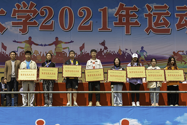 党委宣传部常务副部长唐敦双宣布运动会宣传工作获奖名单。文学与传媒学院荣获运动会宣传工作一等奖,经济与管理学院、法学院、信息工程学院获二等奖,化学与环境工程学院、医学部、体育学院、马克思主义学院、林学园艺学院获三等奖。
