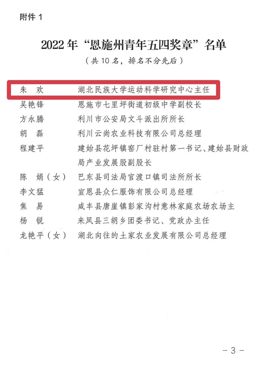 5月7日, 共青团恩施州委、恩施州青年联合会发布2022年“恩施州青年五四奖章”名单,金年会体育学院青年教师朱欢名列榜首。