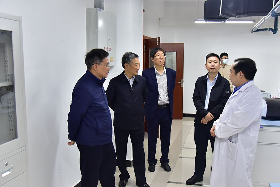 董长麒(左一)在顿祖义(左二)、祝建波(左三)的陪同下参观武陵山中药材检验检测中心
