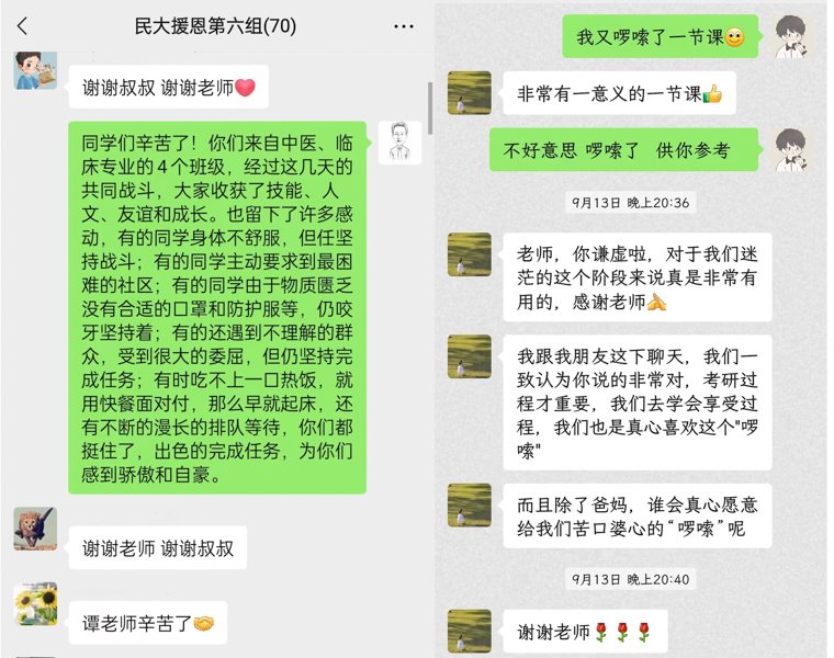 “在我们的交谈过程中,另一位同学也来到阳台。这堂‘啰嗦’课有了两位听众。”黄筱钧说,和两位同学交流完毕后,她们主动加了我的微信,于是有了后面的微信交流,更让我意想不到的是,这两位同学很快调整好了心态,第二天还主动申请去了龙凤镇辖区最远的村碾盘村,并一直在这个村开心地工作到了最后一天。