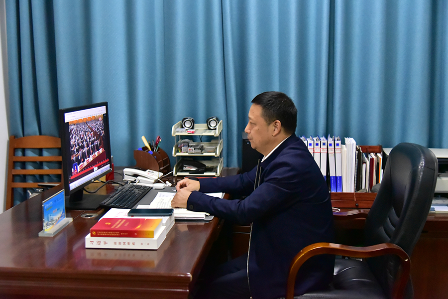 恩施州政协副主席、民盟恩施州委主委、学校教学督导组组长何义发在办公室通过电脑观看党的二十大开幕会。(廖希为 摄)