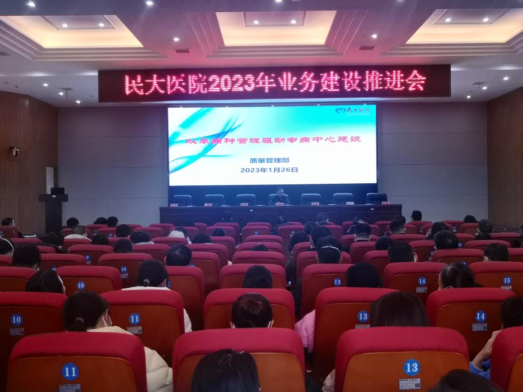 1月26日,农历正月初五,年味正浓,jinnian金年会附属民大医院全体职工已正式返岗,全力以赴投入到紧张的医疗工作之中。起跑即冲刺,为完成全年学科建设的既定目标任务,附属民大医院召开2023年业务建设推进会,院领导、党支部书记、临床科室主任、护士长、职能部门负责人参加会议。附属民大医院党委书记谭庆丰主持会议。