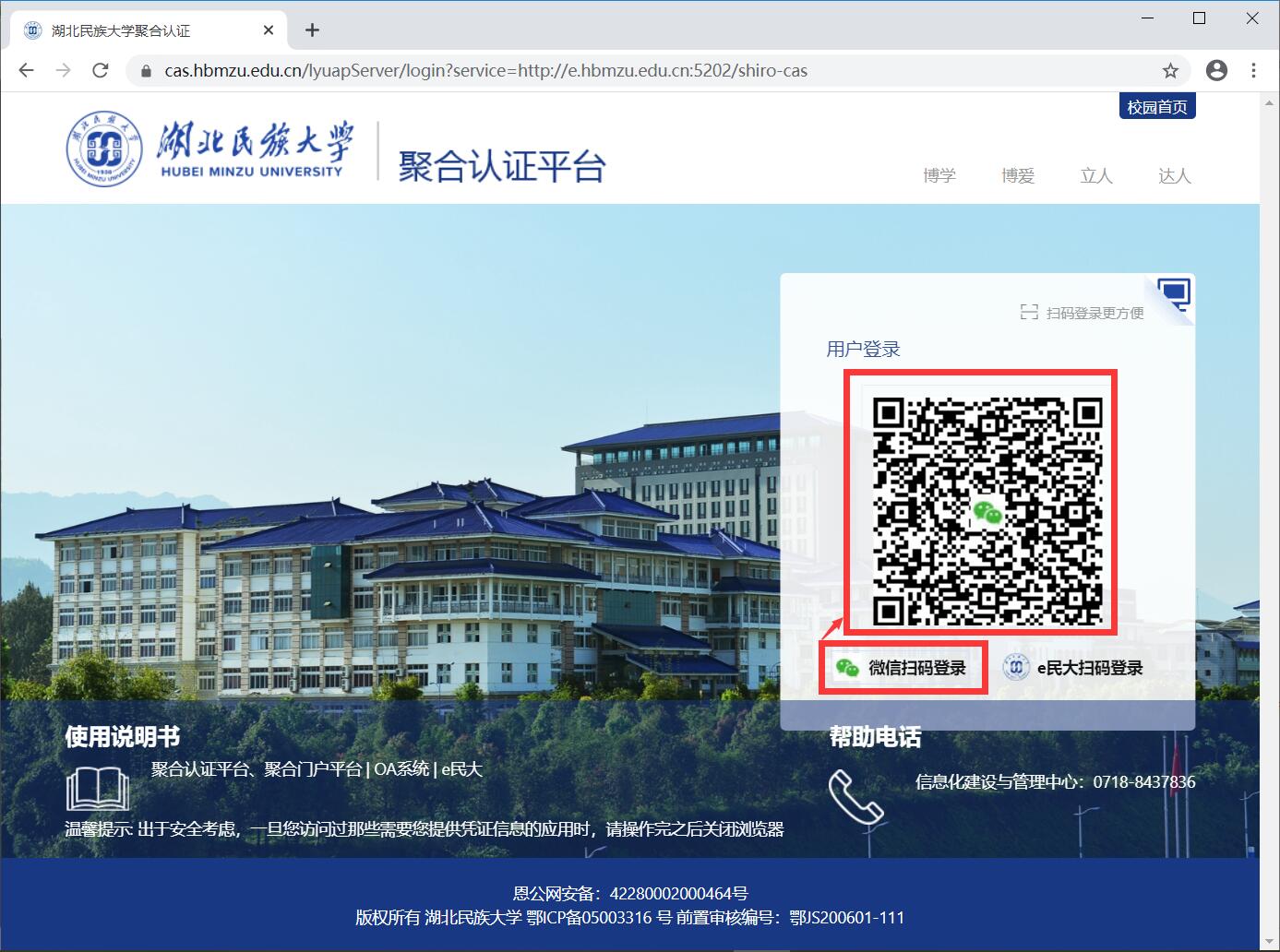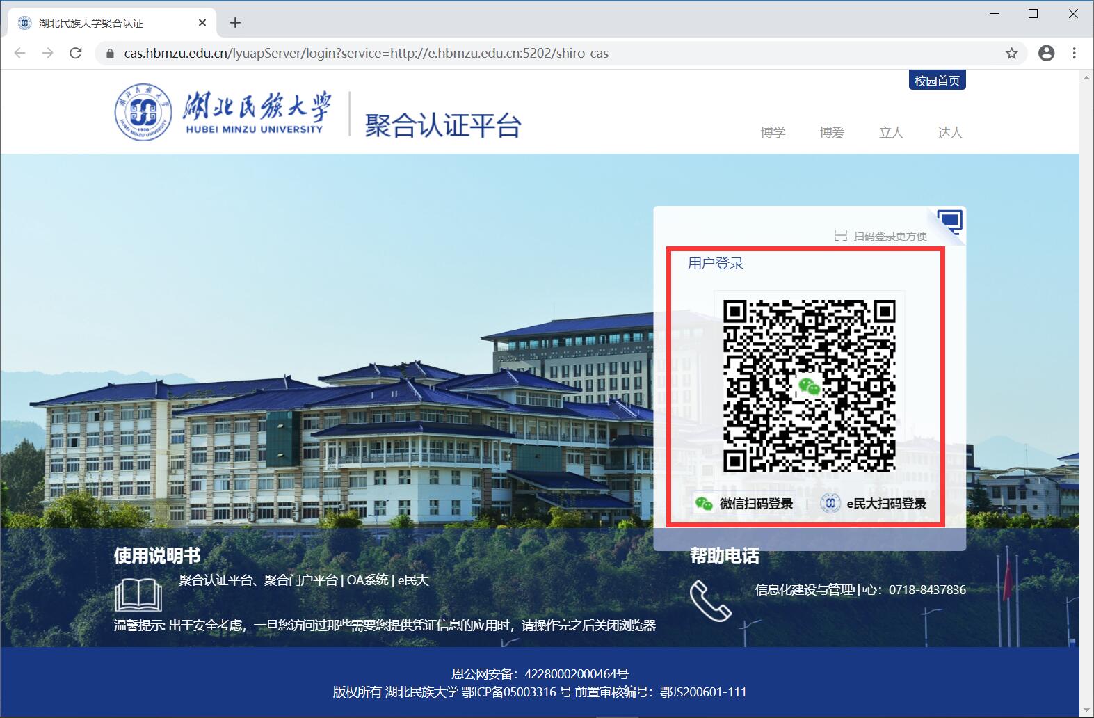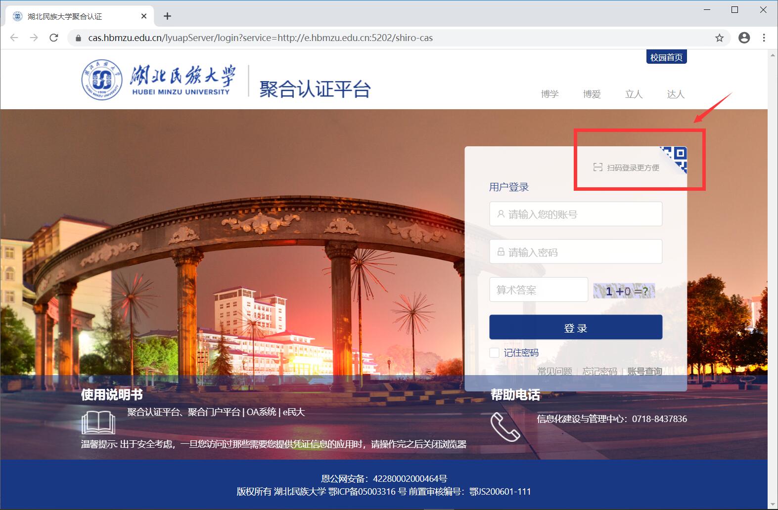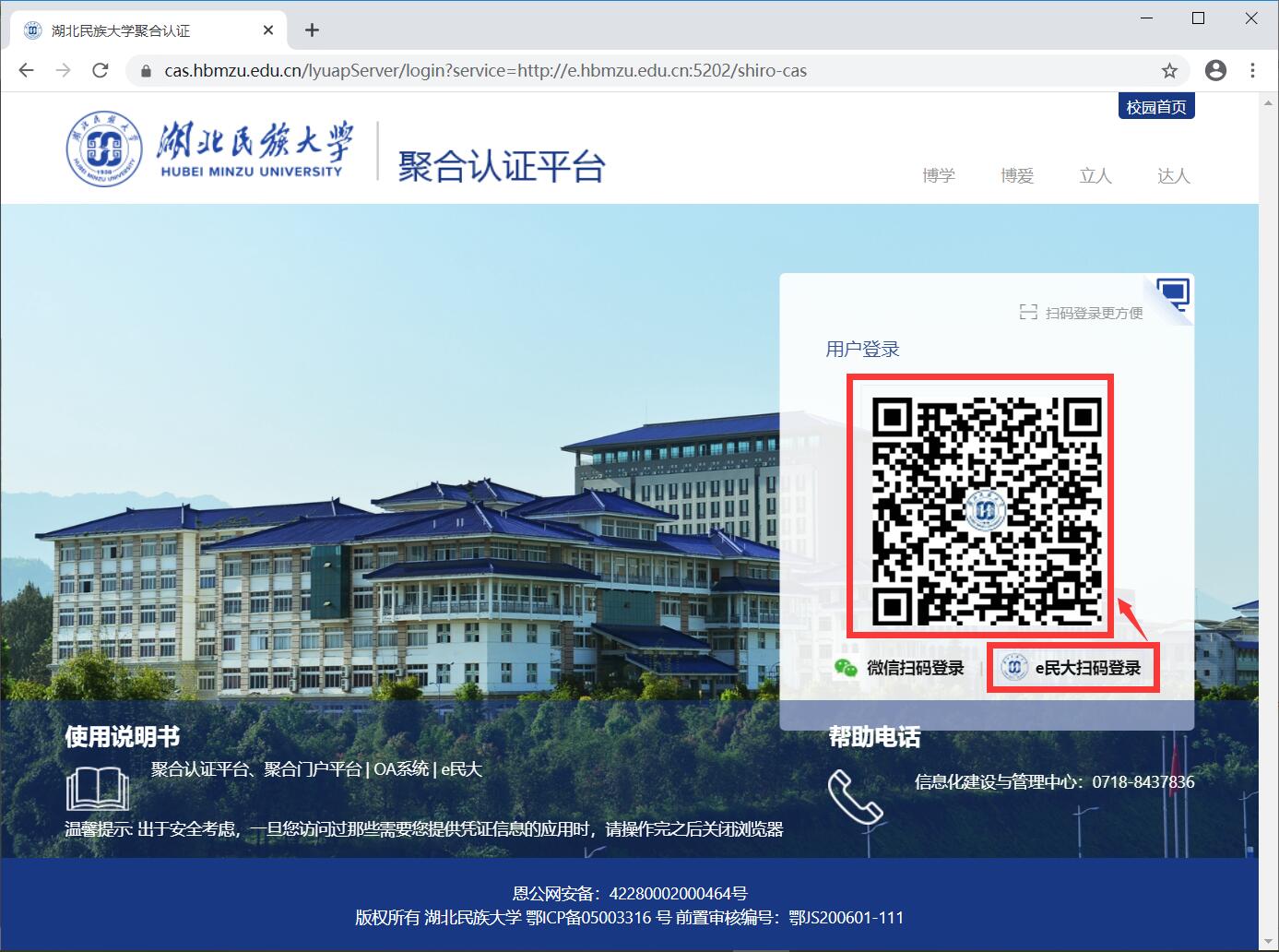 1、点击登录框右下角“e民大扫码登录”自动生成二维码,手机打开e民大APP点击“扫码登录聚合门户”,如图 8、图 9所示