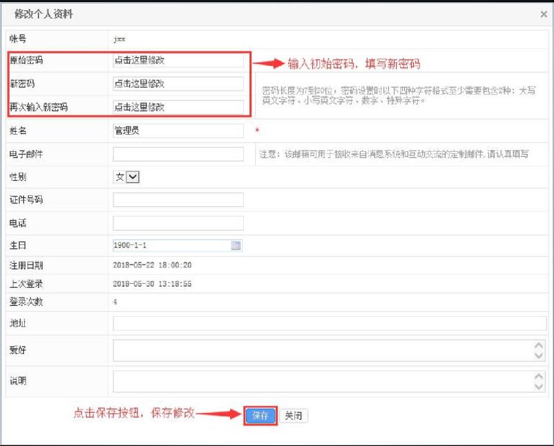 二、在图 2管理员名片中选择“修改个人资料”,在弹出的编辑框中修改管理员初始密码,如图 3示: