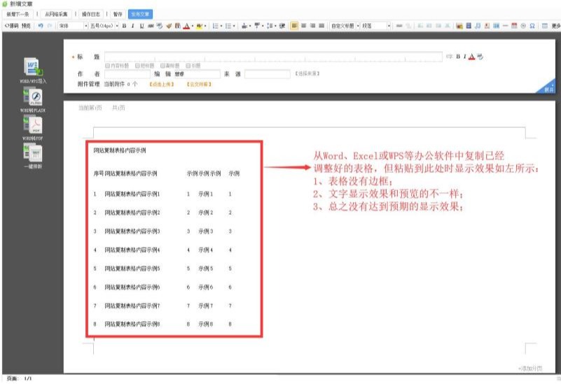 从Word、Excel或WPS等办公软件中复制已经调整好的表格,但粘贴到此处文章页面时显示效果如下图所示,其中表格没有边框、文字显示效果和预览的不一样等,总之没有达到预期的显示效果。
