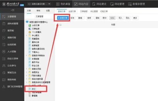 网站群管理系统中,对于栏目文章的维护,我们可以在“网站内容”→“文章管理”中进行维护或进行网站栏目文章的添加。如图1所示: