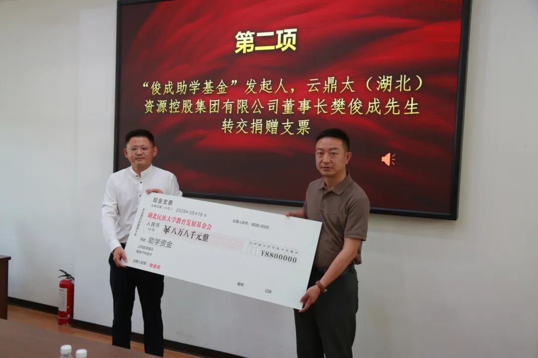 “俊成助学基金”发起人,云鼎太(湖北)资源控股集团有限公司董事长樊俊成先生转交捐赠支票。