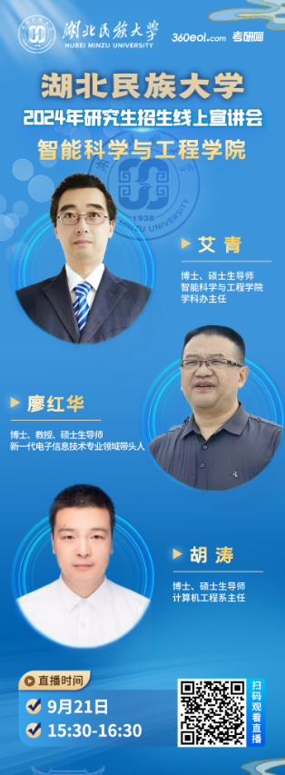 jinnian金年会智能科学与工程学院艾青、廖红华、胡涛三位老师莅临直播间,为广大考生解读研招政策、专业详情。欢迎广大考生及家长扫描下方海报二维码观看!