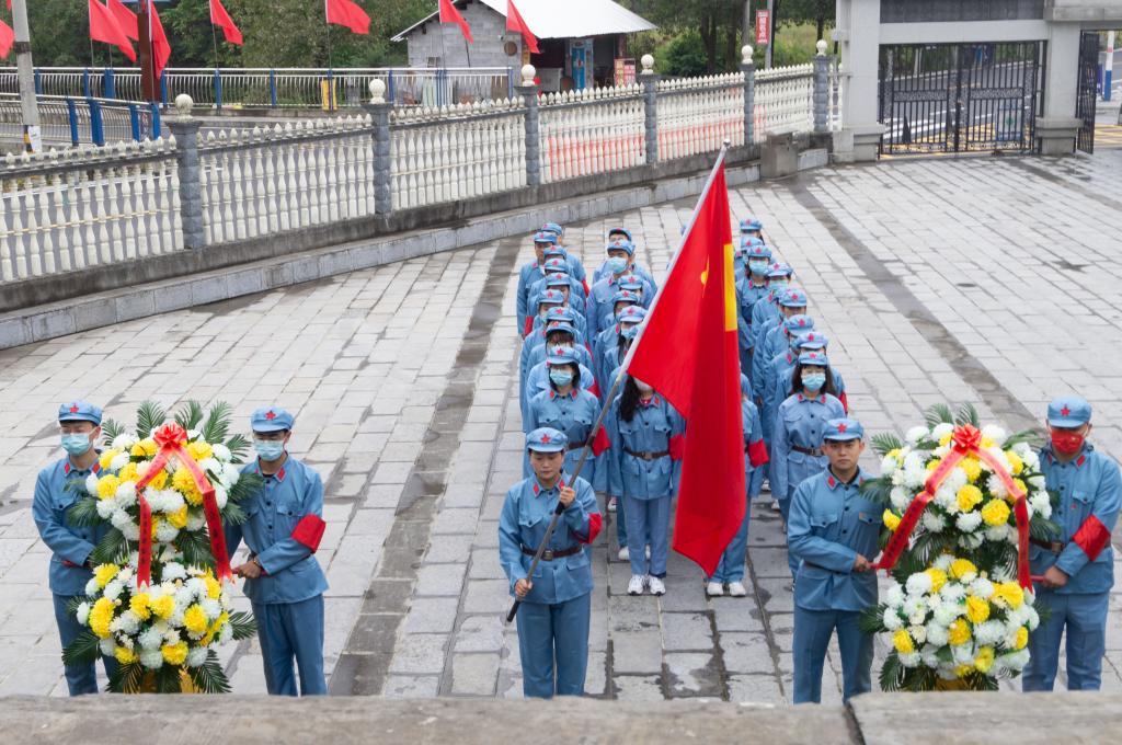 抵达忠堡大捷纪念公园后,全体成员奏唱国歌、向革命先烈献花、整理缎带,并在支部书记向浩老师的带领下重温入党誓词,为革命先烈默哀一分钟。随后,忠堡大捷纪念公园解说员带领瞻仰英雄纪念碑,学习贺龙将军等革命先烈的革命故事。参观结束后,师生在纪念园举行拔河比赛。
