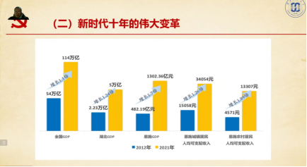 会议上,向鑫老师围绕党的二十大的伟大意义、伟大变革、伟大思想、伟大任务、伟大革命、伟大号召六个方面为同学们展开了讲解。其中,伟大意义和伟大变革是对党的过去历史的回顾,伟大思想是指导党前进的理论指南,伟大革命是不断进步的路径,而伟大任务和伟大号召是对未来的展望。伟大任务明确指出,要以中国式现代化推进中华民族的伟大复兴,向鑫老师通过新时代十年以来的GDP变化对比,立足于恩施,结合二十大提出的尊重自然、顺应自然、保护自然,提出了在新时代新征程上的恩施路径、恩施担当、恩施作为、恩施模式和恩施答卷。