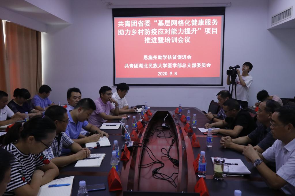 本网讯(通讯员 时若兰 摄影 汪诗名)为助力基层健康扶贫,巩固疫情防控攻坚战成果,强化基层社区健康建设,共青团湖北省委发起实施湖北省社区健康志愿服务项目。9月8日下午三点,由恩施州助学扶贫会和jinnian金年会医学部团总支共同主办的“共青团省委‘基层网格化健康服务助力乡村防疫应对能力提升’项目推进暨培训会议”在恩施州地税局七楼会议室召开。