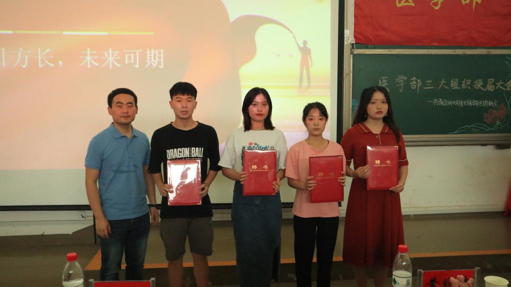 播放完三大组织的工作回顾视频后,上一届优秀学生干部代表谢能能、何娜娜、邓诗琪进行发言,谢能能强调学生干部之间要加强交流,要注意工作和学习之间的平衡;何娜娜表示要在为同学们服务中体会乐趣;邓诗琪希望大家能不忘初心,努力成为更优秀的自己,继往开来,砥砺前行。新任学生干部代表唐聪,汤祖璇,朱雪婷发言,他们表示自己今后要承担更多的责任,履行更多的义务,起到模范带头作用。随后,各组织指导老师为学生组织主要负责人颁发聘书。