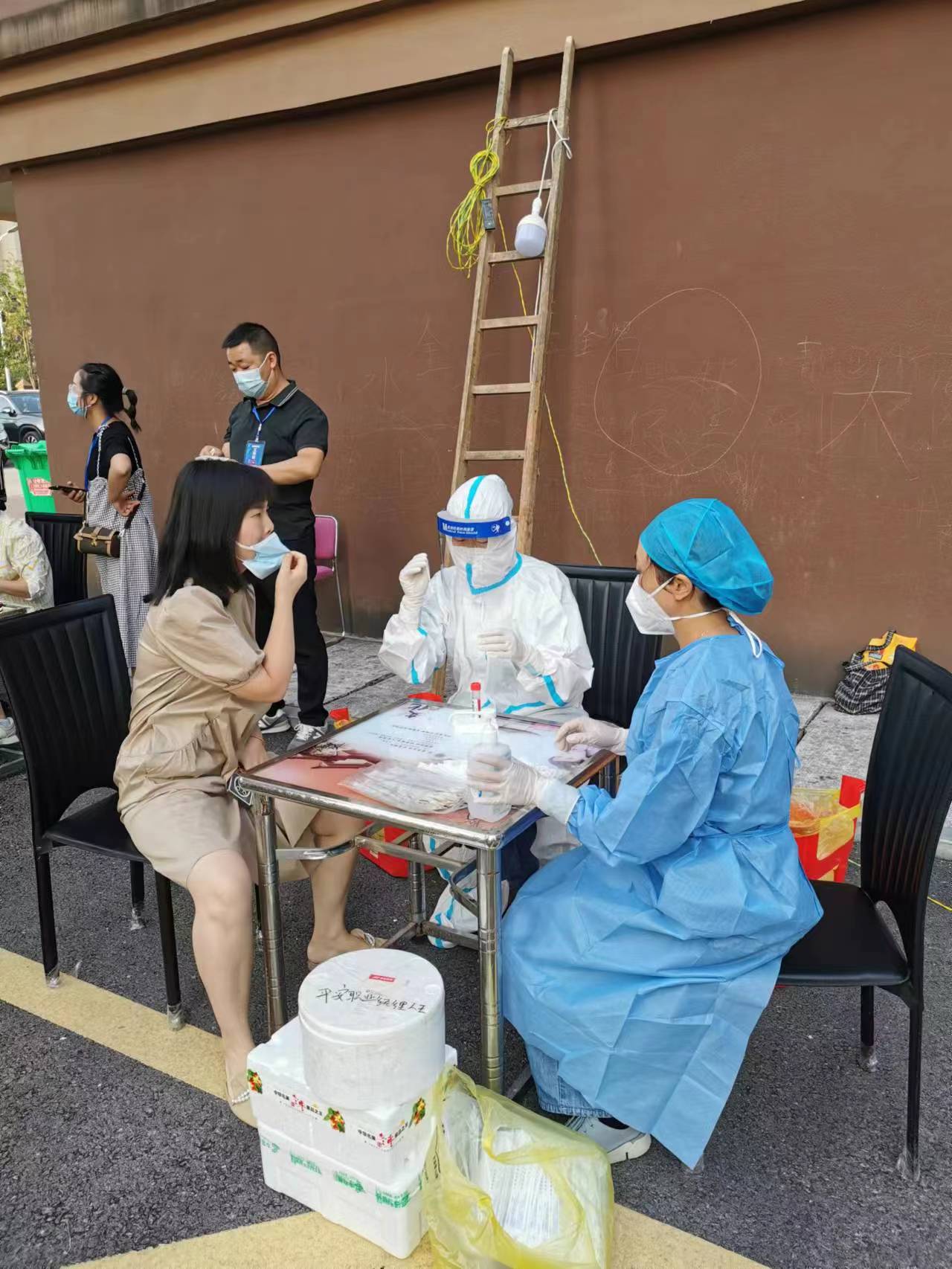 这支队伍负责的区域是市政府大院,这里是老旧小区,共有20栋步梯房,志愿者们冒着高温,穿着防护服,每一栋都要从1楼爬到7楼,来回往返。三人组里有位女生是第一次参与入户核酸采样,由于防护服穿着全封闭,她大量出汗,因进水不便差点脱水。途中社区网格员一直加油打气,建议若她坚持不住的话就可以休息一下。但她坚定地回答:“我一定会完成任务,与同伴一起完成采样任务,与同伴共奋进。”回到休息区脱下防护服的那一刻,志愿者们鞋子、手套、口罩里全是汗水,下沉的党员干部以及工作人员看到此状连忙去到居民家中冲来白糖水为志愿者们补充能量。