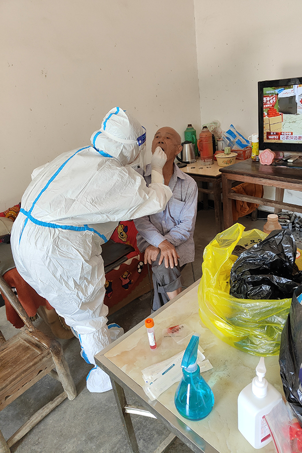 9月11日早上5时30分到9时30分,若干志愿者入户为小区20栋楼里行动不便的老人进行核酸采样。志愿者三人一组,社区网格员负责敲门消杀、民大医学生负责样本采集以及信息扫码登记。志愿者们全副武装,共完成87人次核酸样本采集。