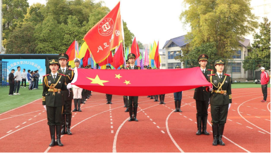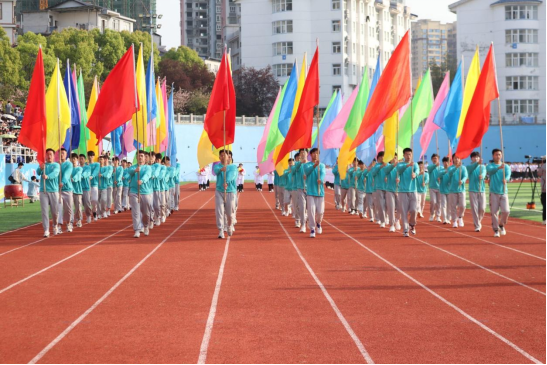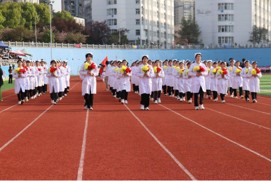 伴随着昂扬的运动会进行曲,各代表队依次入场。国旗护卫队迈着整齐的步伐,昂首挺胸地走向主席台,由上届团体总分第一名医学部派出的彩旗队、鲜花队以及各二级学院运动员代表队伍紧随国旗护卫队之后,按顺序依次入场。