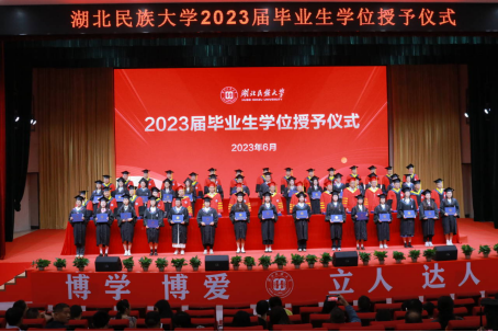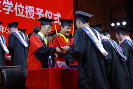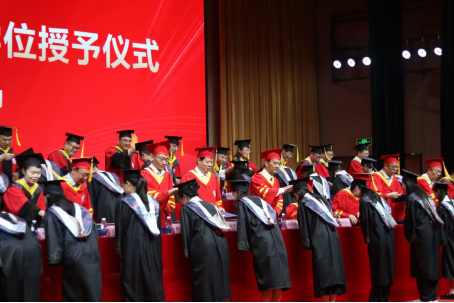 大会在庄严的国歌中拉开序幕。大会伊始,党委常委、副校长刘志军宣读jinnian金年会2023届毕业生学位授予决议。紧接着,党委书记向前进,党委副书记、校长顿祖义,党委副书记、副校长汪兴平,党委副书记邓磊,党委常委、总会计师余来,党委常委、纪委书记张宏磊,党委常委田景福,党委常委、副校长刘志军及23位学位评定委员会成员为毕业学子们依次拨穗、颁发学位证书,并一一合影留念。