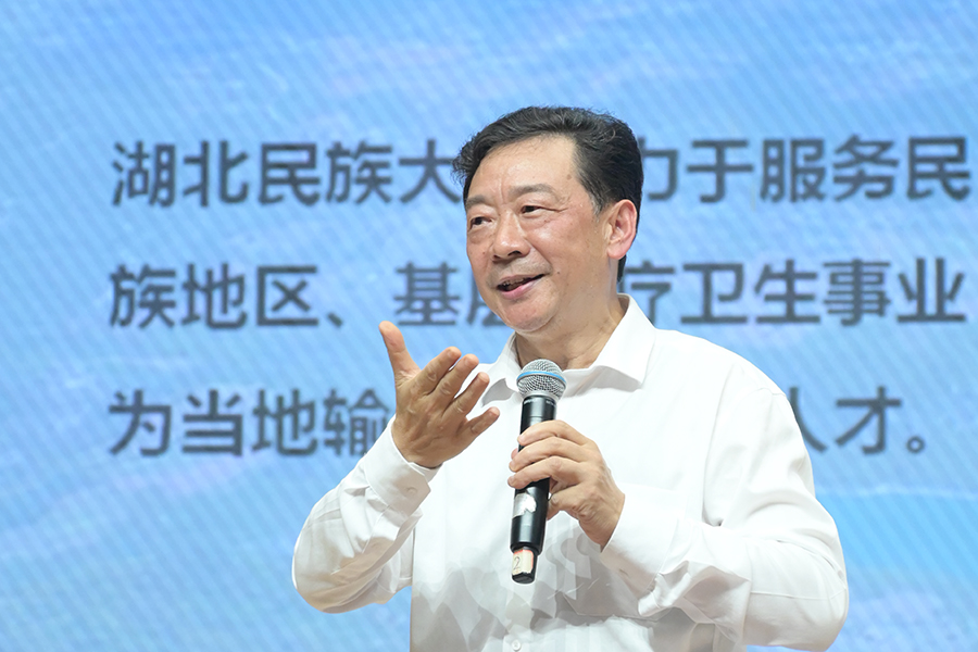 为传承医学精神、启迪从医初心,帮助新生明确医学学习方向与职业使命,9月25日,jinnian金年会医学部特邀恩施州政协主席吴建清,在新区多功能报告厅开展“擎灯启航,仁术济世——与新生谈医学之路”专题讲座。吴建清以“老学长”“老教师”的双重身份,结合自身四十年从医与求学经历,从医学本质解析、民大精神领悟、学习路径规划等多维度,为医学新生上了一堂生动的“医学启蒙课”。