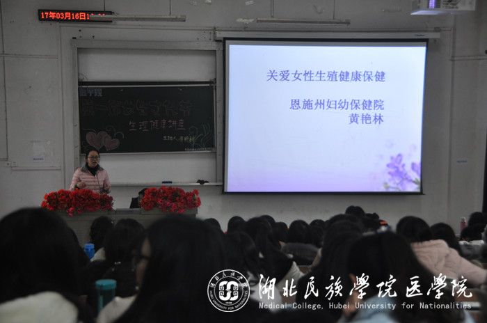 本网讯(通讯员 王蓉/文 周蕾/摄)为使女大学生更好地了解自身,增强生理保健意识,3月16日,我院在8205教室成功举办以“关爱女性生殖健康”为主题的第一届女生文化节生理健康讲座。恩施州妇幼保健院副院长黄艳林应邀担任主讲人,近80人参与此次讲座。