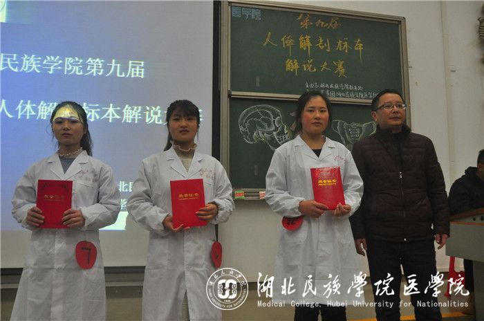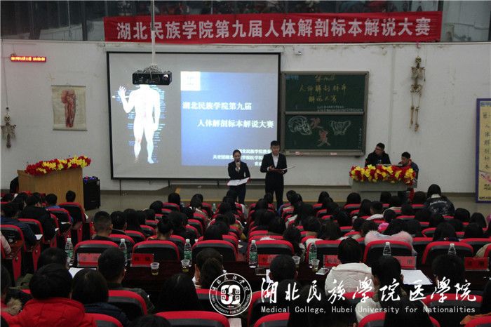 本网讯(通讯员 李明辉 苗佩佩 卢天琳/文 杨漫丽/摄)为弘扬医学风采,进一步展现我院特色,12月11日,由金年会教务处主办、我院团委承办的第九届人体解剖标本解说大赛决赛于修远楼5B509教室举行。我院解剖教研室老师李国贵、陈龙菊、谭文波、吴刚、谭刚担任评委,我院党委副书记张蕊、学生科科长向驰及团委书记张鼎应邀出席。