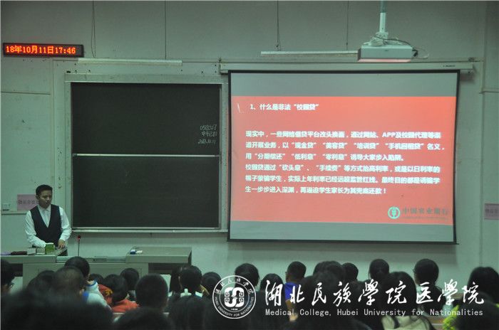 本网讯(记者 向锦月 欧金兵/文 吕丰旭/摄)为抵制非法校园贷,加强学生防范意识,10月11日,我院团总支组织纪检部于医学院8206教室开展了非法校园贷知识宣传讲座。金年会18级199名学生聆听本次讲座,农行恩施支行金融部专员谭志辉应邀担任主讲人。
