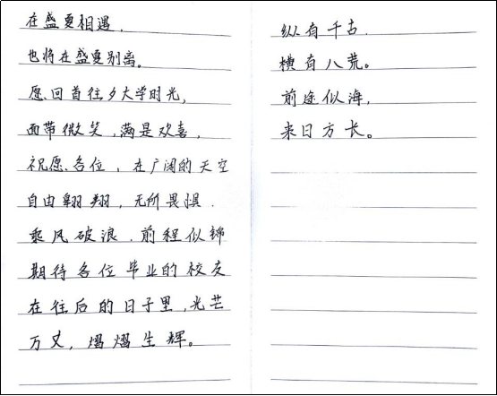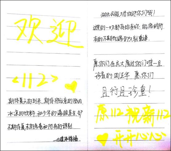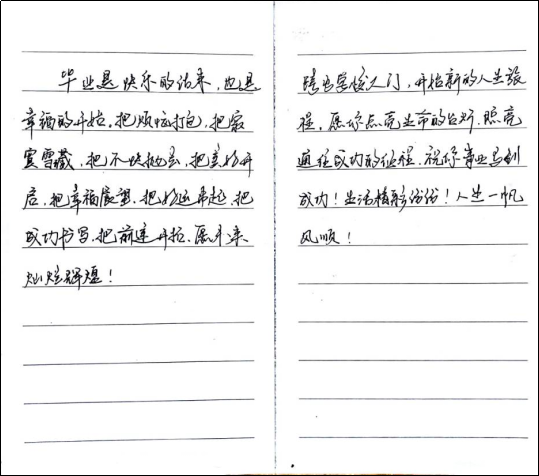 本次活动由医学部公寓管理委员会成员深入毕业生宿舍发放“志高室洁·毕业寄语”文明离寝书信。“期待夏天的到来,期待那适意的微风,冰凉的饮料和少年的满眼星光,却不期待夏天的考卷和所有的辞别”;“亲爱的学弟学妹,希望你们能适应大学生活,汲取知识,不断充实自己,成为更有力量的你”;“愿有一份热,发一份光,就像萤火一般,也可以在黑暗里发光,不必等候炬火”“斗转星移,花开花落,民大始终是你们心灵的港湾、精神家园,始终是你们成就梦想的坚强后盾”。毕业生宿舍成员以书信的方式凝聚青春故事,传递民大精神,激励学弟学妹,表达对母校、校友的美好祝福。扫一间寝室、留一封书信、寄一份嘱托,展示了医学部学子的良好风貌。