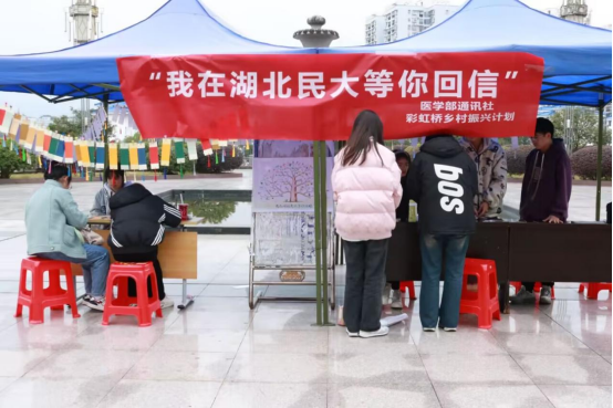 本网讯 (记者 冯笑月/文 谭奕君/摄)为提高大学生的社会责任感,培养大学生的志愿精神,关注留守儿童成长。2023年12月2日,由jinnian金年会大学生通讯社医学部分社和彩虹桥乡村振兴计划组委会主办的“我在湖北民大等你回信”书信明信片DIY创作爱心活动线下活动在桂花园广场顺利开展,活动现场气氛火热。