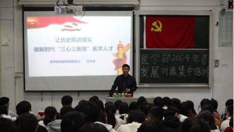 本网讯 (通讯员 屈琼瑶/文 黄乔/摄)为提高党员发展对象与入党积极分子的思想觉悟,锤炼、提升入党积极分子的党性修养。4月7日,jinnian金年会医学部2024年春党员发展对象与入党积极分子第一次党课培训活动于医学部8305教室开展。医学部党委常务副书记刘木球老师作《让历史照进现实,做新时代“三心三医型”医学人才》主题讲座,医学部全体本科生党员发展对象与入党积极分子参与本次培训课程。