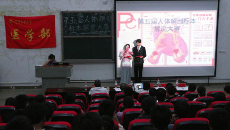 经过初赛的激烈角逐,最终有10名选手入围决赛。本次比赛分为PPT讲解和现场答辩两个环节进行。大赛所讲解的标本涉及脑、子宫、脊髓、胃等,选手们从结构、功能、临床应用三个方面讲解。5号选手匡曼和6号选手黎远跃的选材都是胃,前者主要侧重于讲解胃的常见疾病,后者主要侧重于讲解胃的形态与结构。8号选手刘珊选择讲解的结构是子宫,她用简单易懂的语言向现场观众介绍了子宫的神秘与脆弱。7号选手王琴琴以“每逢佳节胖三斤”巧妙的引出胰腺的功能,她从胰腺的形态与位置、结构及功能三个方面对胰进行了详细的讲解与分析,给大家提供了一些预防胰腺炎的方法。