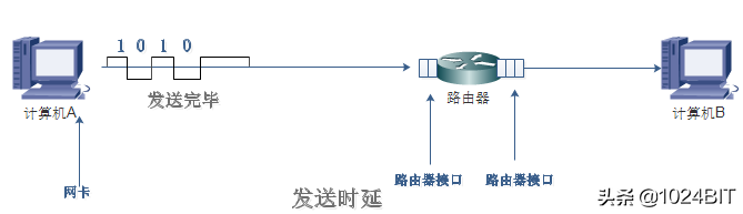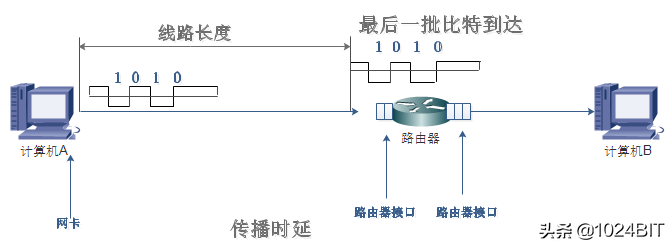 如图所示,从最后一比特发送完毕到最后一个比特达到路由器接口需要的时间就是传播时延。