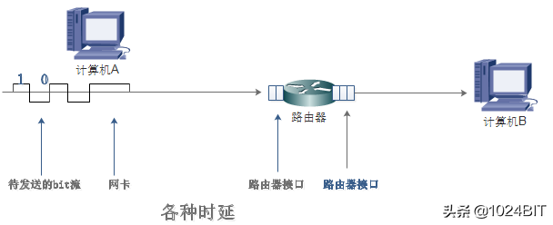 下面就以计算机A要给计算机B发送数据为例,来说明网络中的时延包括那几个部分。