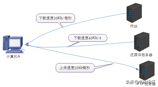 上图中,计算机A同时浏览网页、在线看电影、向FTP上传文件。A计算机的吞吐量就是全部上传和下载速率的总和,即30+40+20=90(Kb/s)。