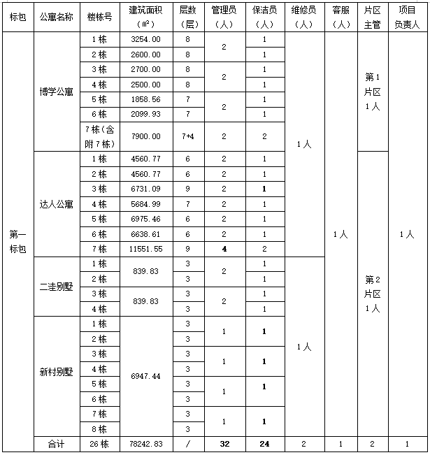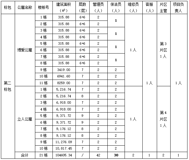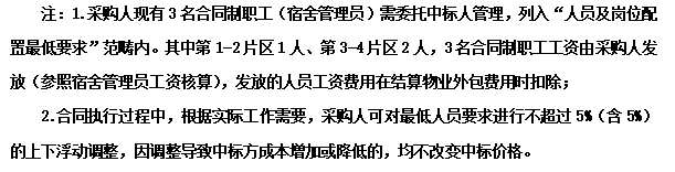 (2)第三章 项目需求书“3.人员及岗位配置最低要求”,第一标包管理员由31人调整为32人,保洁员由29人调整为24人;第二标包保洁员由34人调整为30人。具体修改内容见下表。
