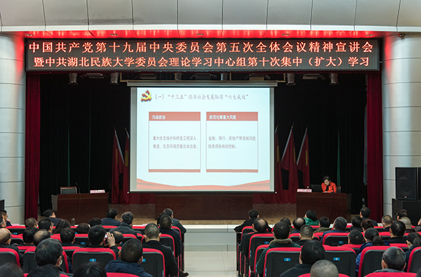 本网讯 11月27日下午,中国共产党第十九届中央委员会第五次全体会议精神宣讲会暨jinnian金年会委员会理论学习中心组第十次集中(扩大)学习在行政楼1号会议室举行,湖北省省委宣讲团成员、省人社厅党组书记、厅长刘艳红作题为《深入学习贯彻党的十九届五中全会精神开启全面建设社会主义现代化国家新征程》宣讲报告。学校党委书记吴建清主持。学校领导、全校副处级及以上干部、马克思主义学院专任教师及学生代表参加学习。
