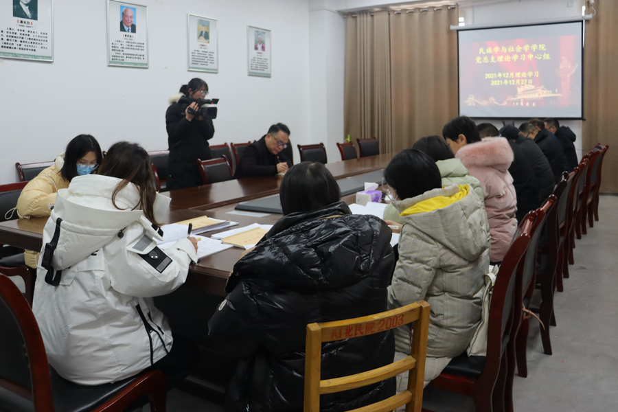 12月27日,民族学与社会学学院党总支理论学习中心组开展党的十九届六中全会精神专题学习,学院党政领导班子成员、党总支委员、科室负责人及教师党员代表参加学习。学校党委宣传部对学习进行了巡听旁听。民社学院党总支书记曹召胜主持学习并领学了《中共中央关于党的百年奋斗重大成就和历史经验的决议》重要内容。