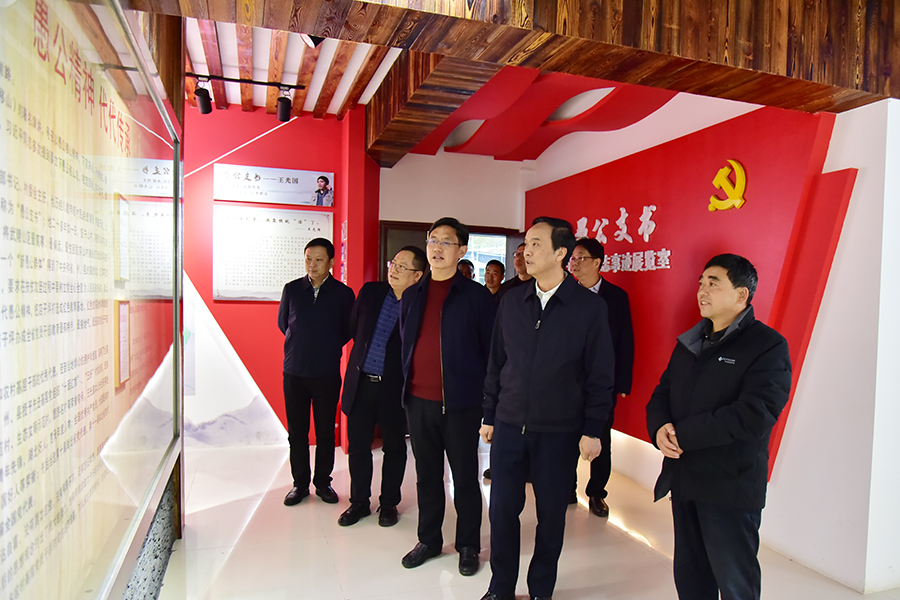 向前进(前排右二)在张渊平(前排右三)陪同下调研店子坪红色教育基地