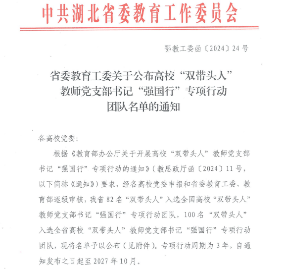 近日,中共湖北省委教育工委公布了高校“双带头人”教师党支部书记“强国行”专项行动团队名单,金年会马克思主义学院思想政治教育系党支部书记蔡诗敏入选全国高校“双带头人”教师党支部书记“强国行”专项行动团队,数学与统计学院教师党支部书记王清龙入选全省高校“双带头人”教师党支部书记“强国行”专项行动团队。