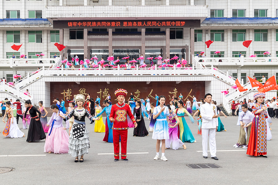 在行政楼前,一场以“中华民族一家亲 同心共筑中国梦”为主题的音乐舞蹈快闪活动精彩上演。来自不同民族的青年学生手捧鲜花、轮番登场,唱响了《爱我中华》,用快闪的形式庆祝五四青年节,庆祝恩施州建州40周年,用舞蹈点亮超燃时刻,用音乐唱响青春梦想。